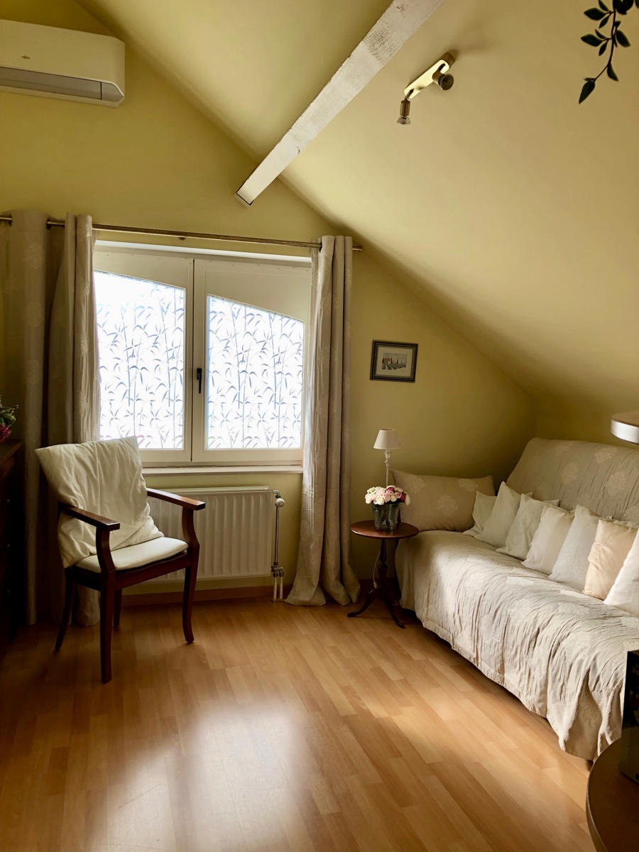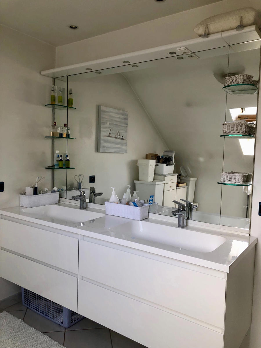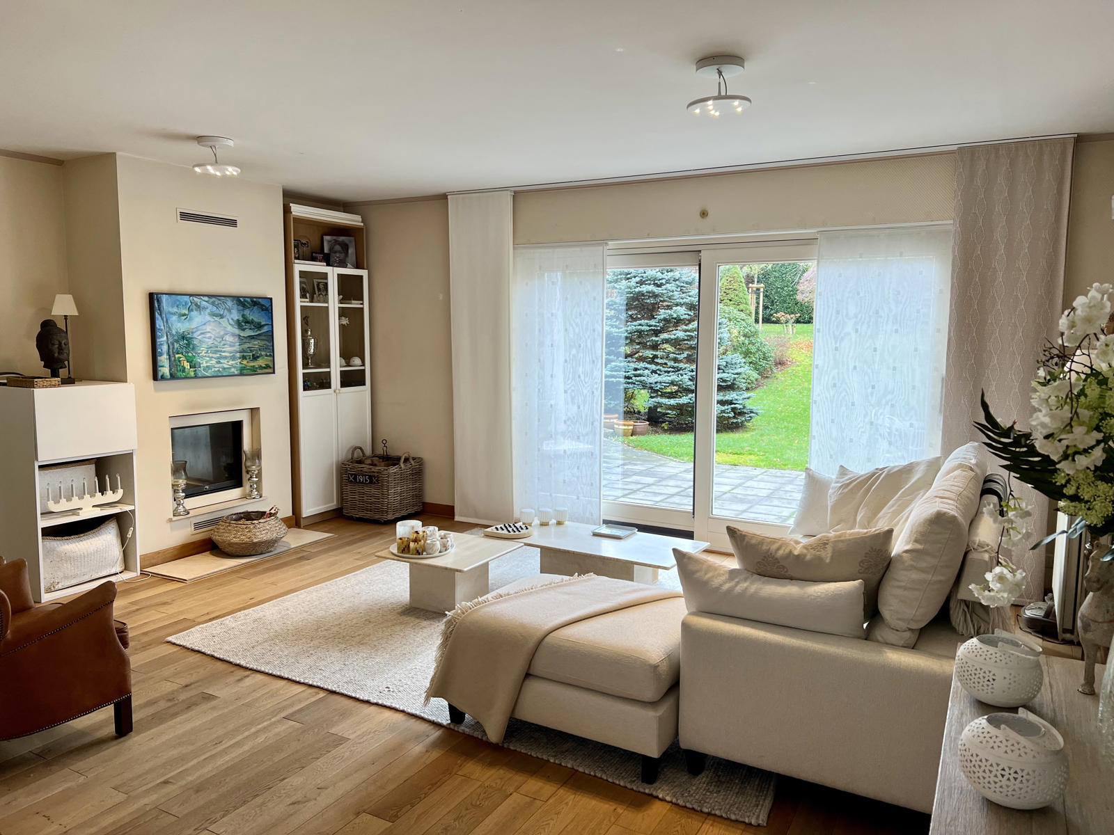 Au rez-de-chaussée, le hall d’entrée donne accès au pièces de vie. Sur la gauche en entrant un bureau, bibliothèque (ou quatrième chambre à coucher).Sur la droite une cuisine super équipée de marque Schmidt de 2019.Toujours sur la droite du hall d’entrée la seconde porte permet d’accéder au séjour en « L » intégrant la salle-à-manger et un salon avec une ouverture sur la terrasse et le jardin orientée au Sud-Ouest. Cette pièce est équipée d’un feu ouvert à cassette avec récupération de chaleur ainsi que d’un système d’air conditionné réversible. Le sol est en chêne massif. Du hall devant soi une buanderie/chaufferie carrelée avec accès à la terrasse ainsi qu’une toilette invité avec lave mains.