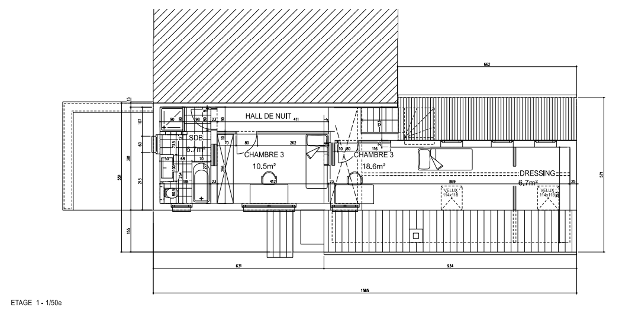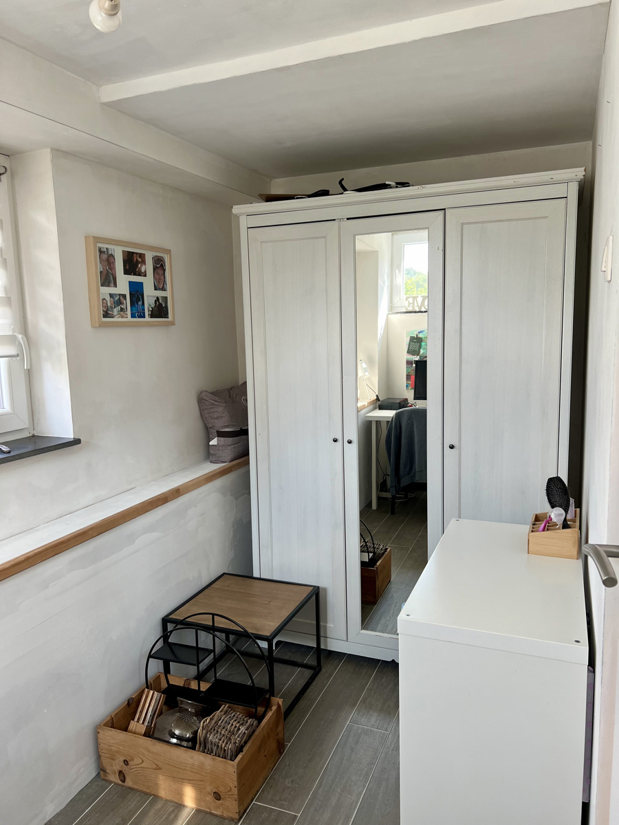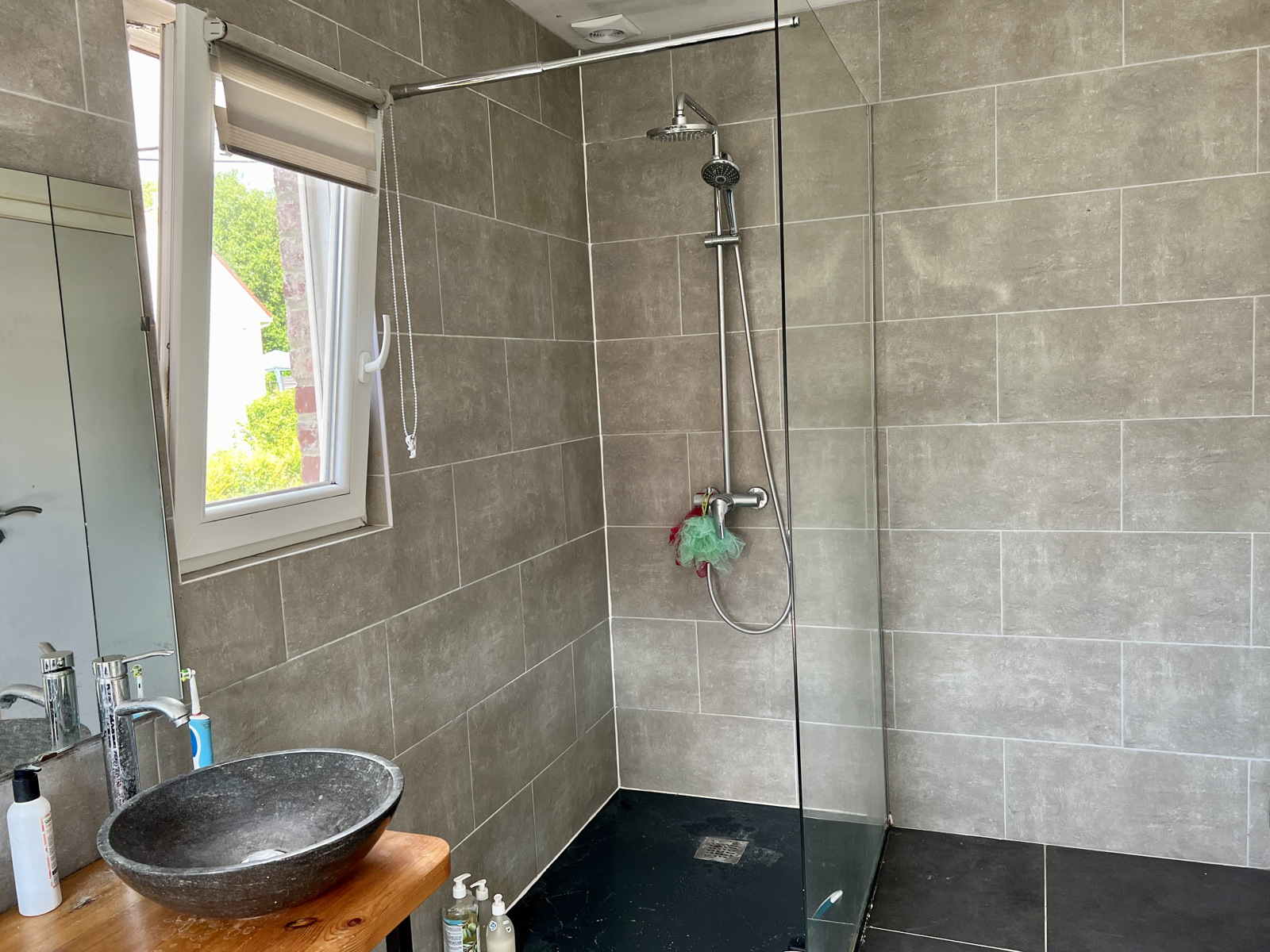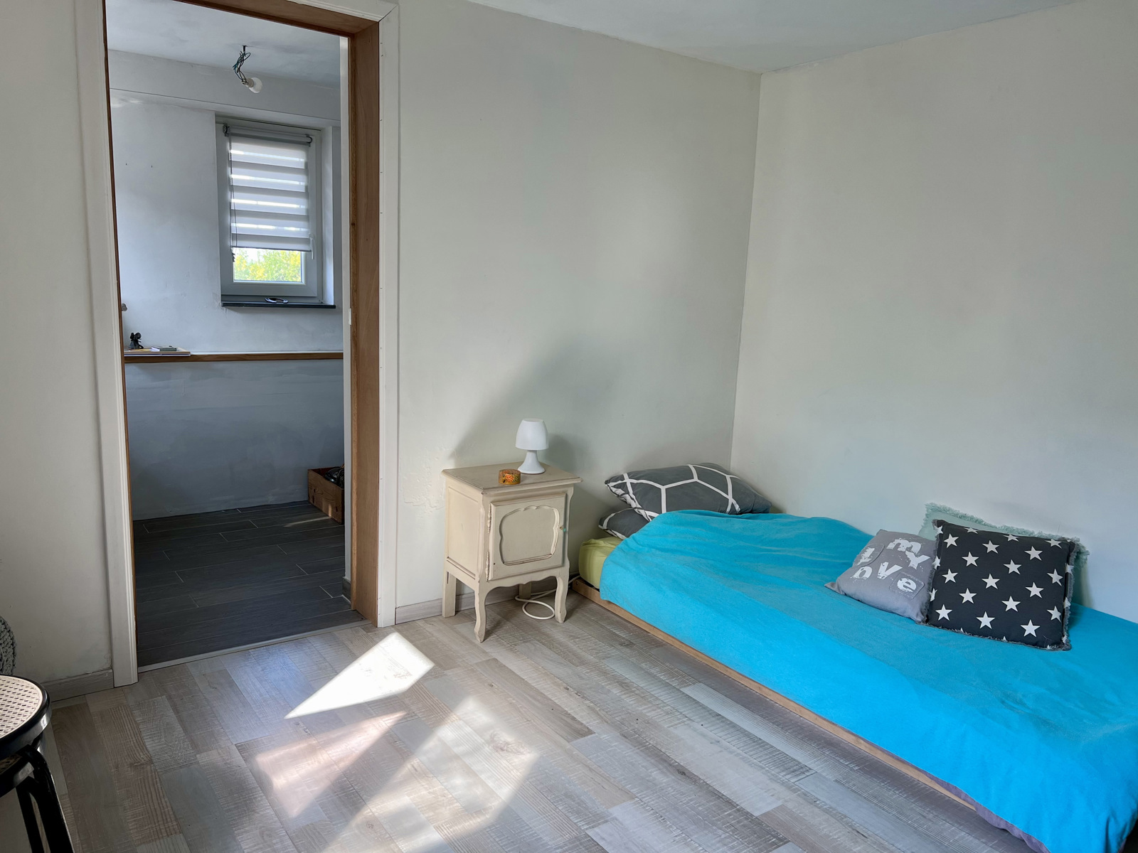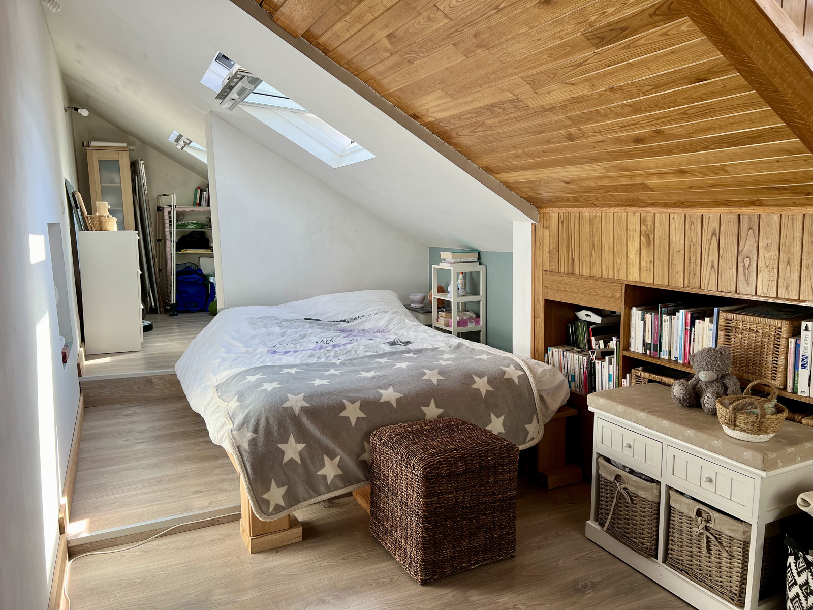 Un escalier permet d’accéder à l’étage. Sur la gauche, la deuxième chambre avec un second espace, une troisième chambre et la salle de douche avec toilette rénovée en ….