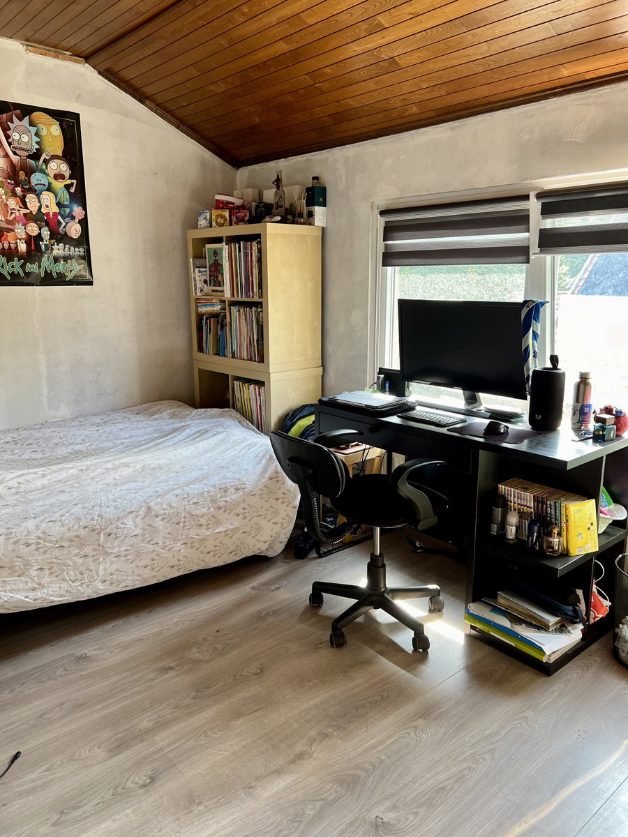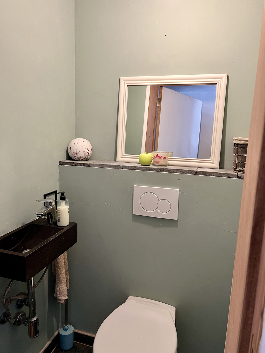 Au rez-de-chaussée : passé la porte d’entrée, un hall mène sur la gauche à une première chambre avec bureau (possibilité d’y installer une salle de bain, le raccordement étant déjà présent). Une toilette invité avec lave main.