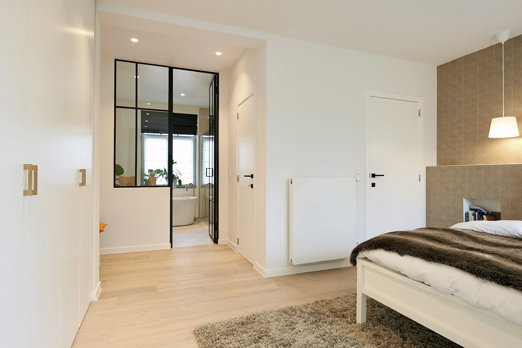 Au second étage, la chambre principale avec placards sur mesure, attenante la salle de bain et douche à l’italienne, toilettes indépendantes.