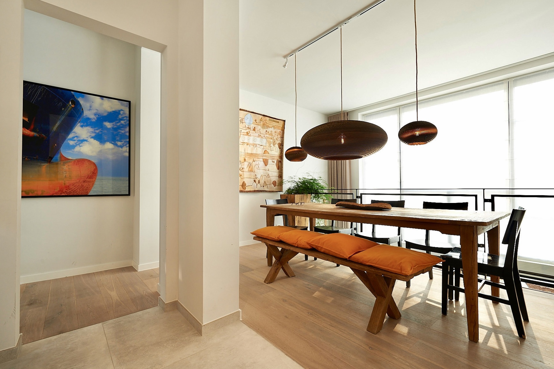 Au premier demi-étage, la cuisine ouverte donnant sur la salle à manger.
