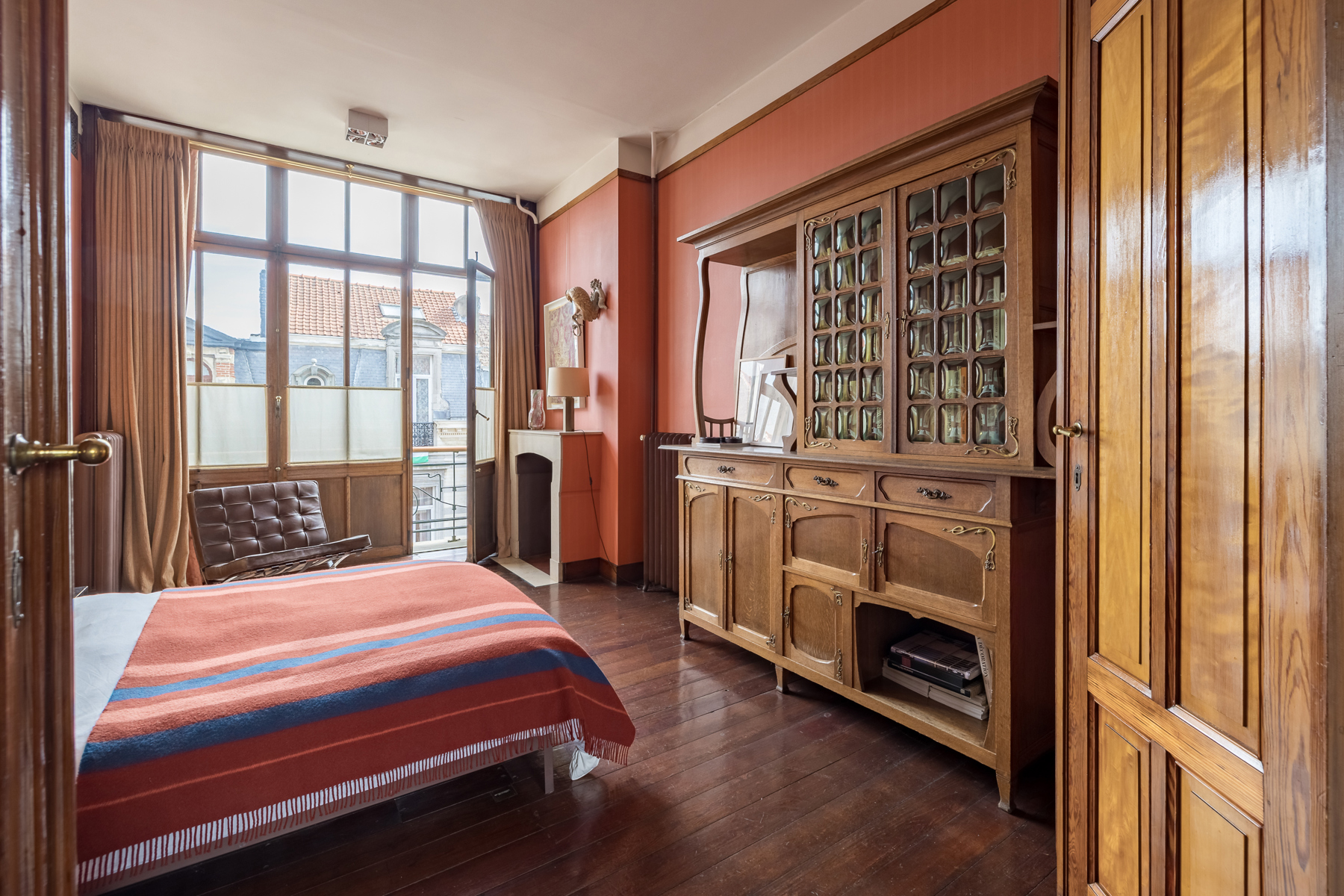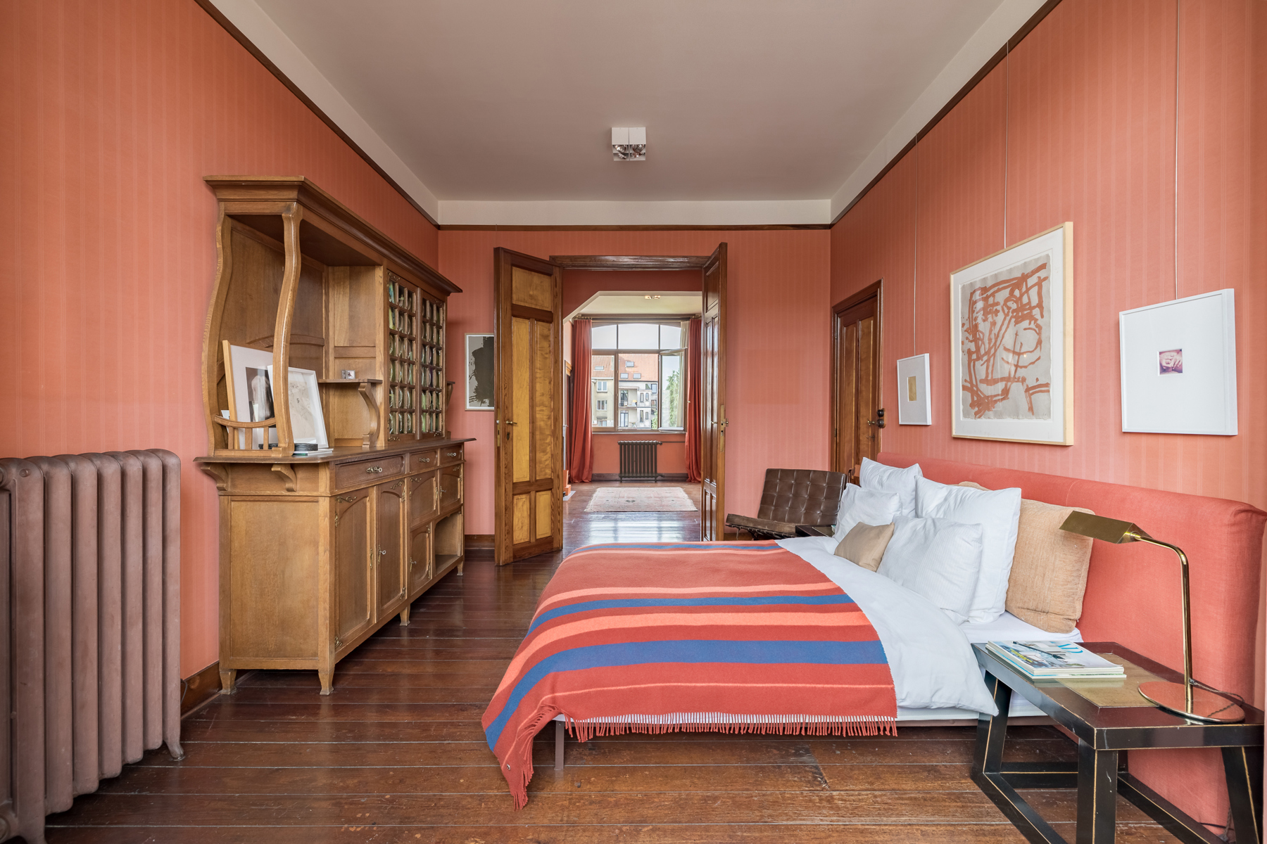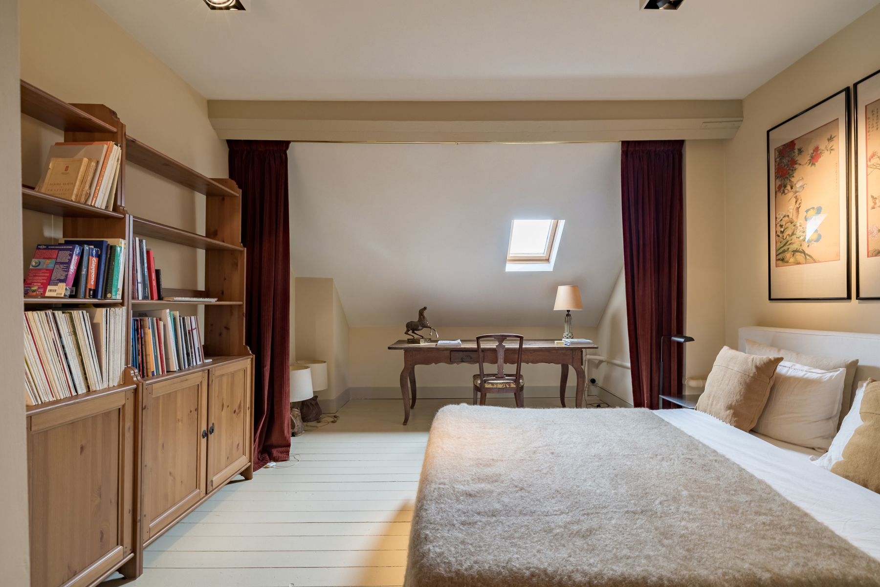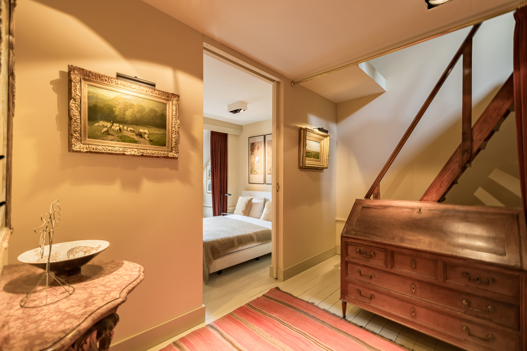Au premier étage la chambre du maître de maison. Au deuxième étage, l’ancien atelier de Sander Pierron illuminée par une grande baie vitrée a été transformé en suite, salle de bain et dressing. Au troisième deux chambres d’invités avec salle de bain. Le chauffage est au gaz.