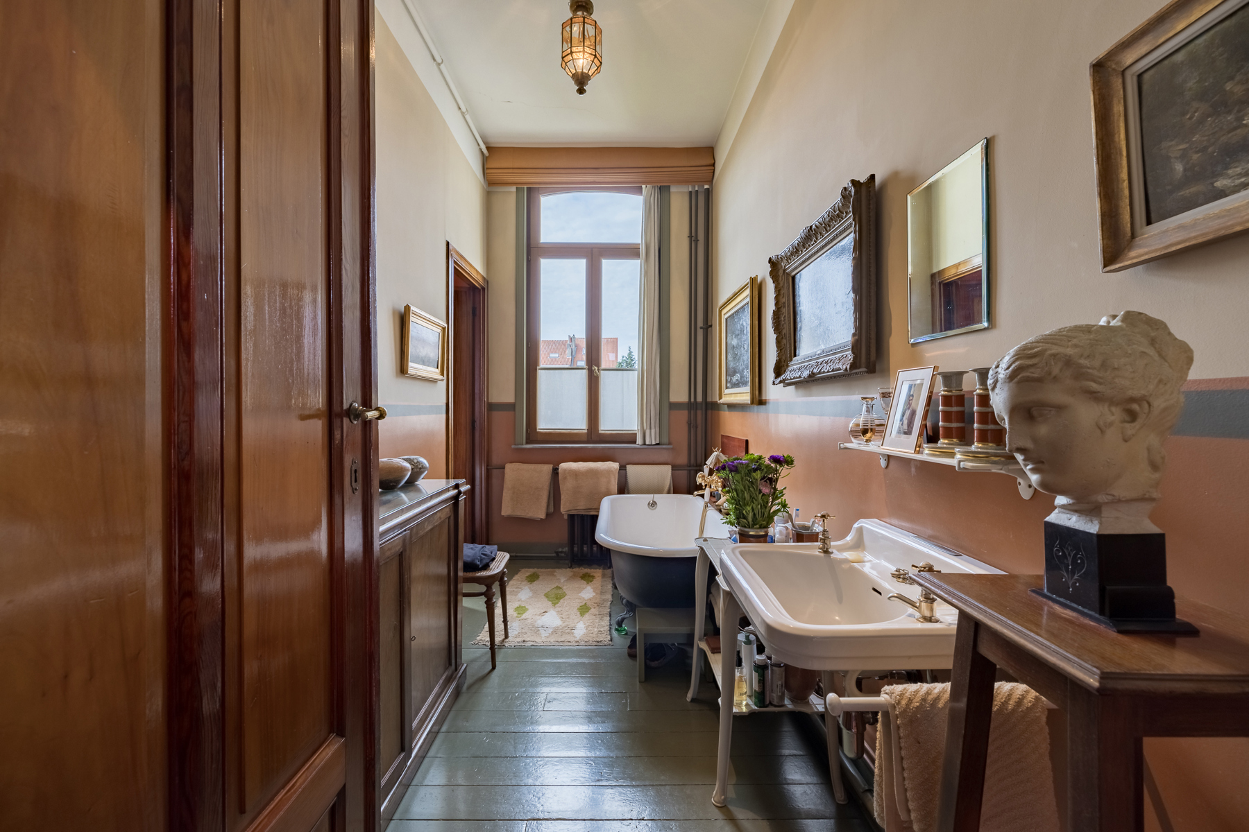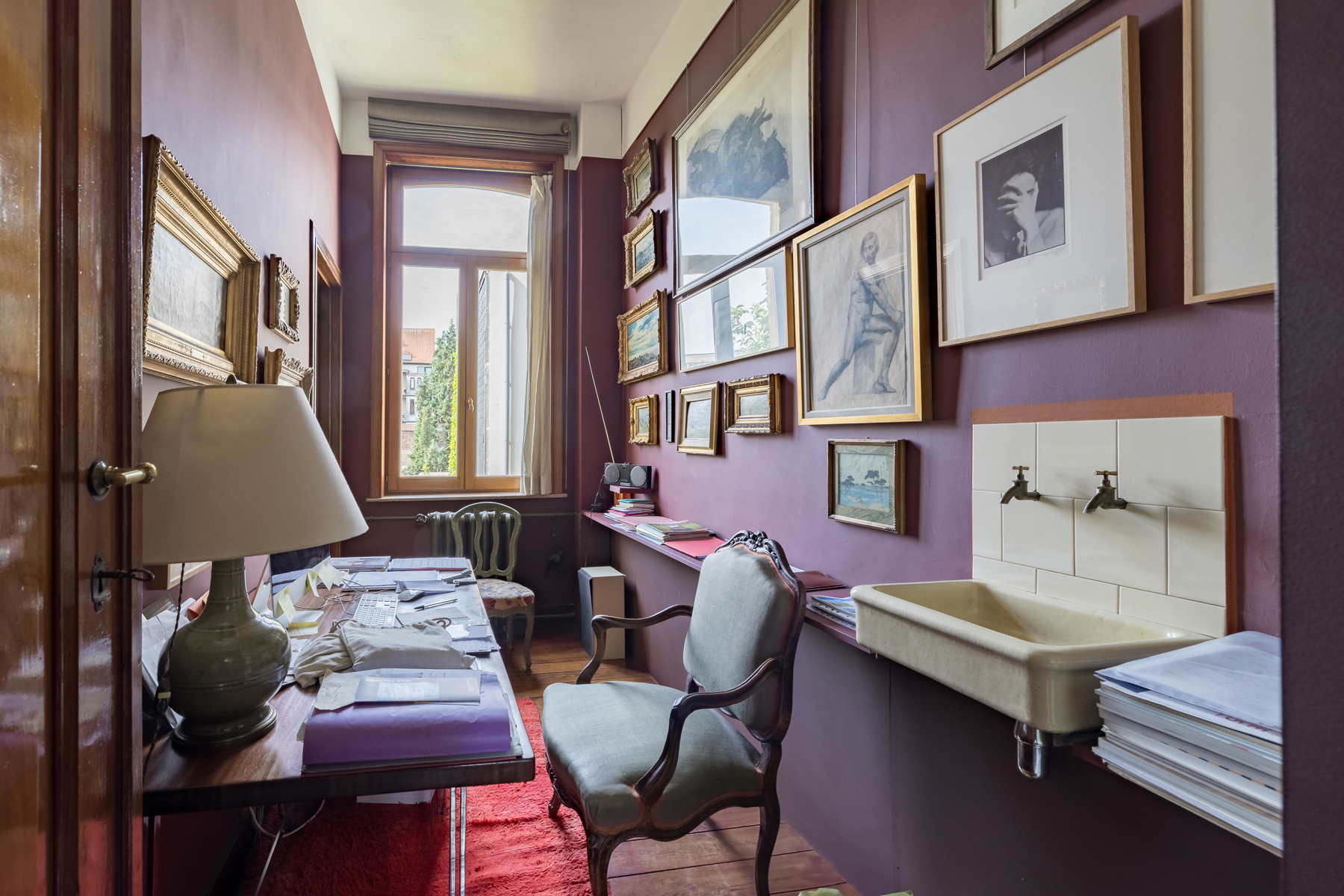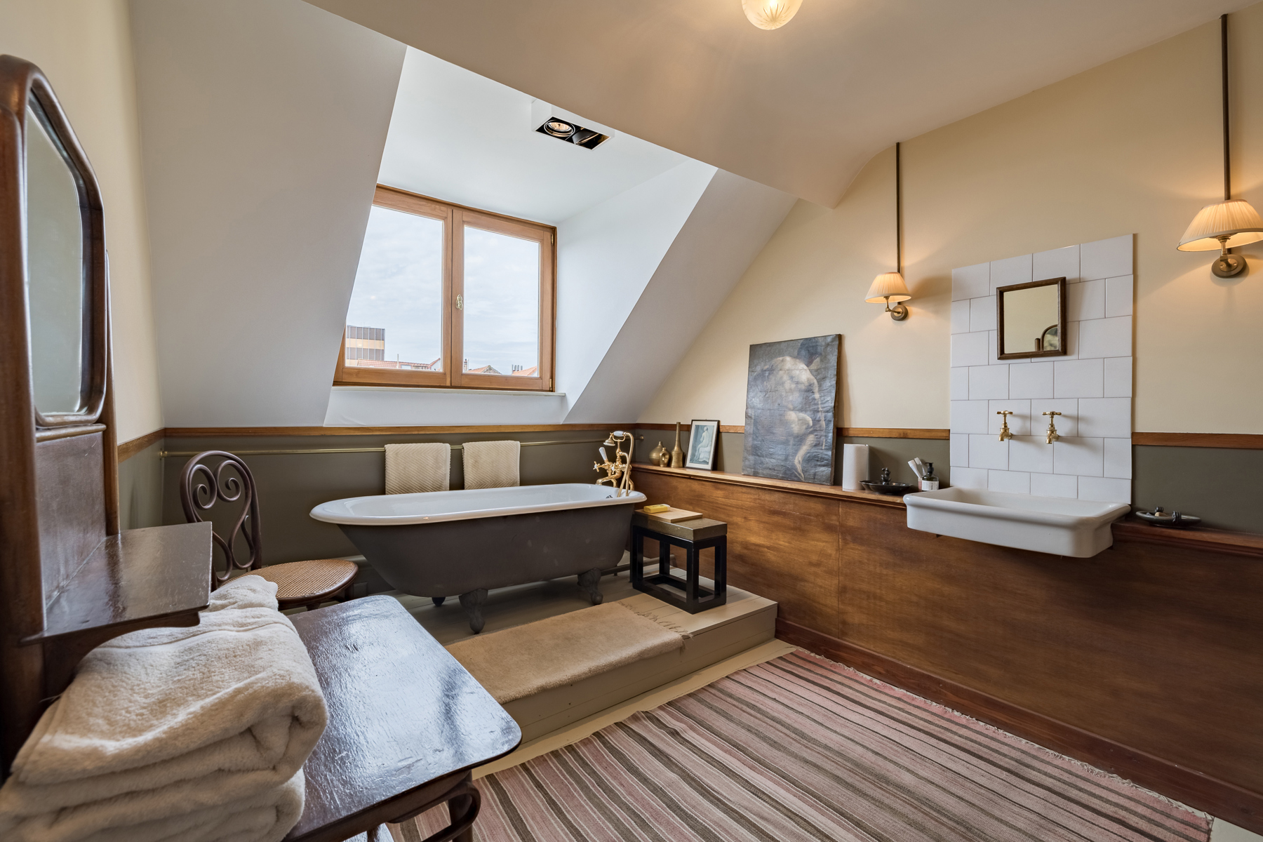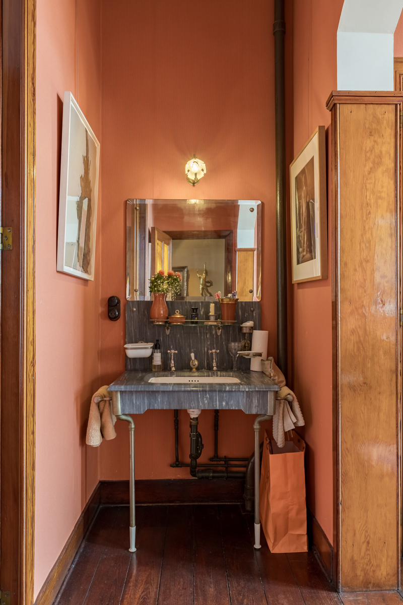 Au premier étage la chambre du maître de maison. Au deuxième étage, l’ancien atelier de Sander Pierron illuminée par une grande baie vitrée a été transformé en suite, salle de bain et dressing. Au troisième deux chambres d’invités avec salle de bain. Le chauffage est au gaz.