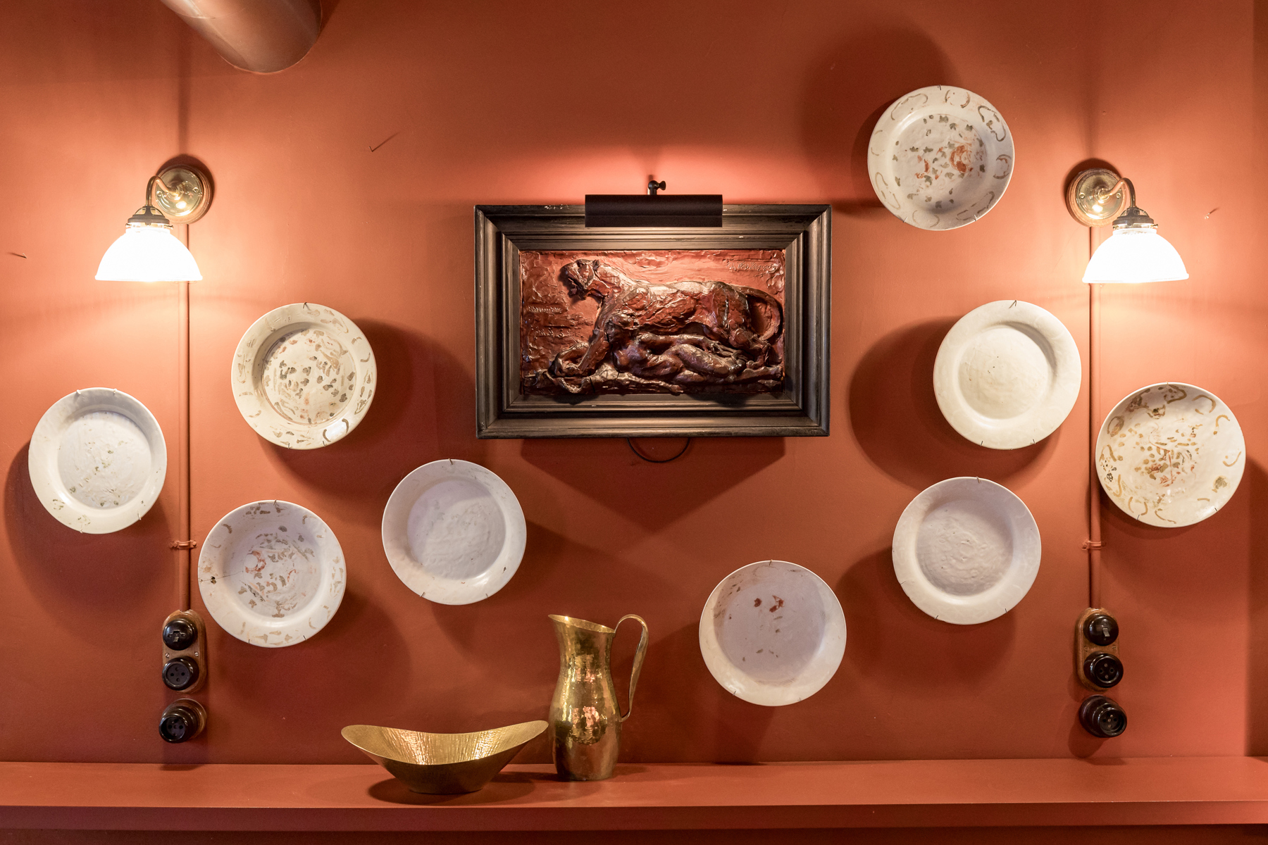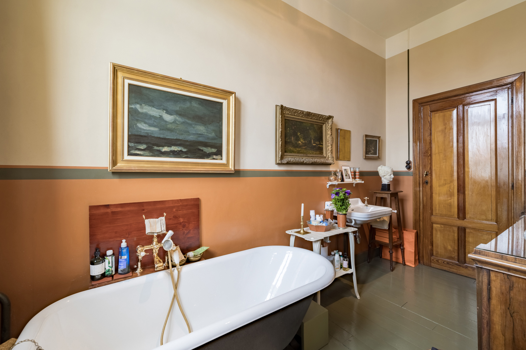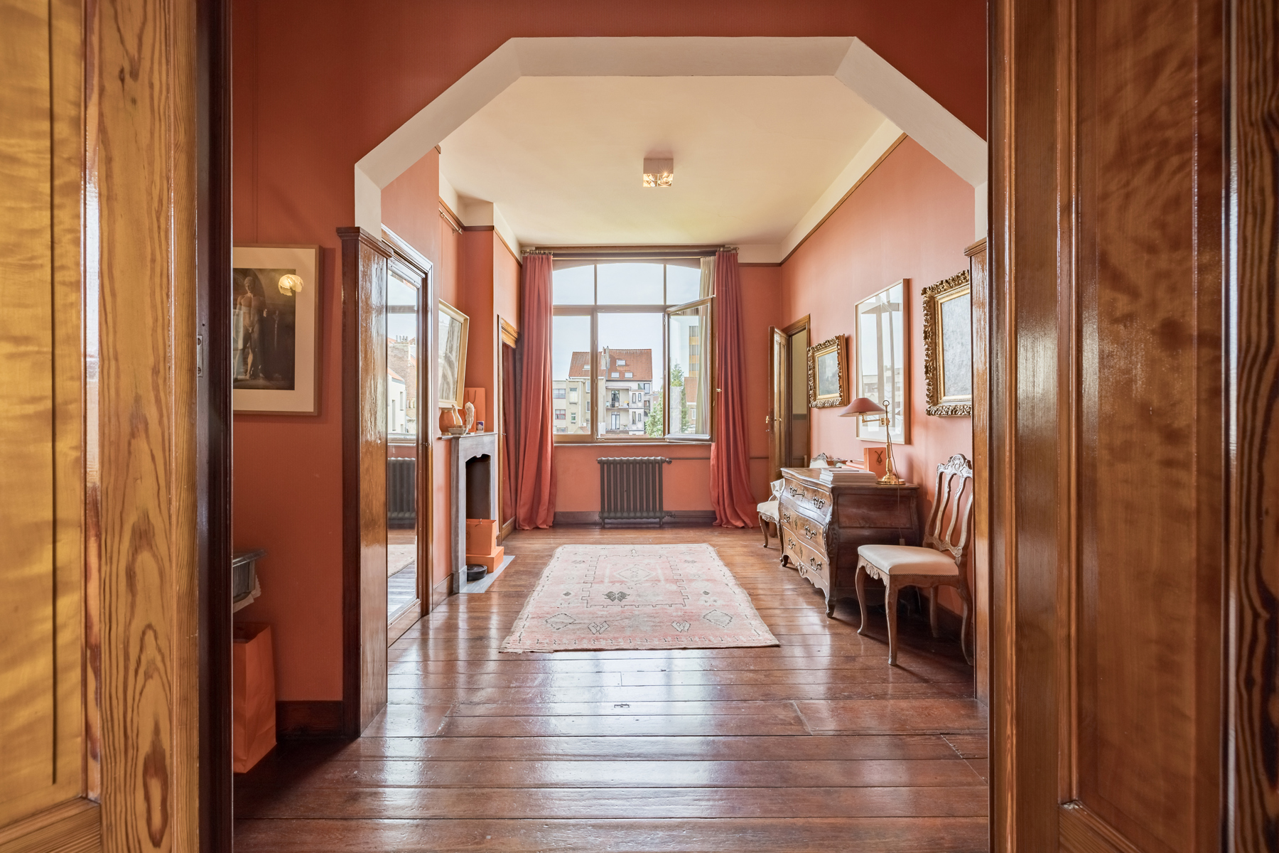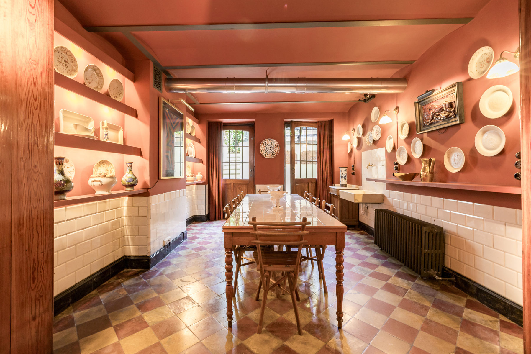 Au premier étage la chambre du maître de maison. Au deuxième étage, l’ancien atelier de Sander Pierron illuminée par une grande baie vitrée a été transformé en suite, salle de bain et dressing. Au troisième deux chambres d’invités avec salle de bain. Le chauffage est au gaz.