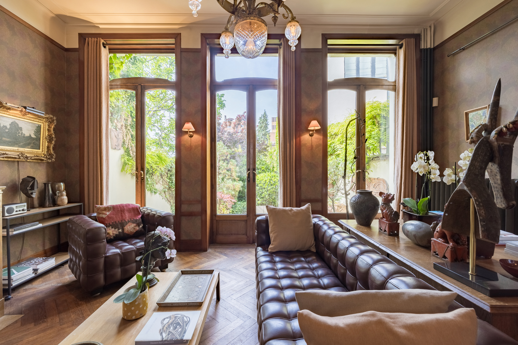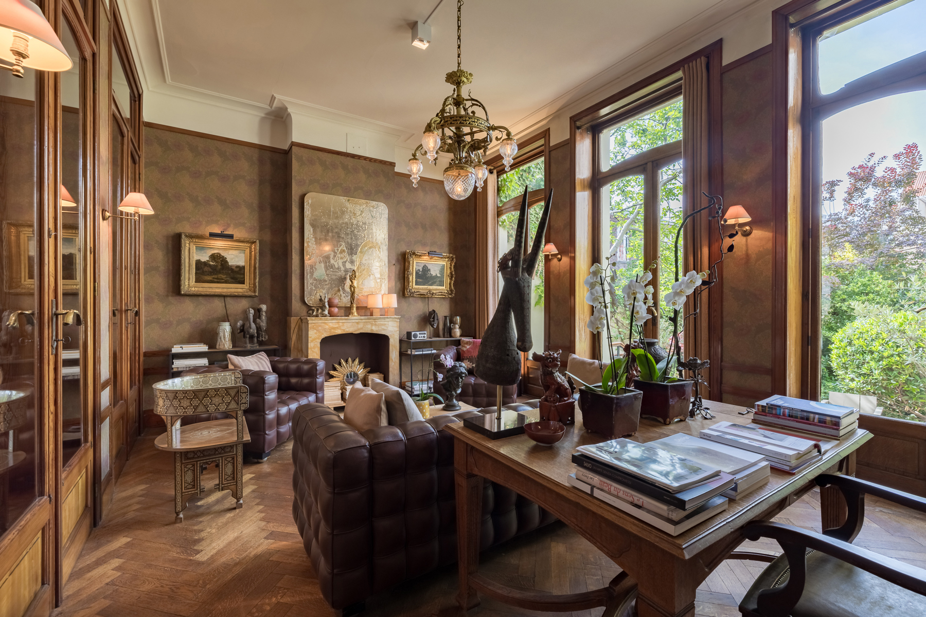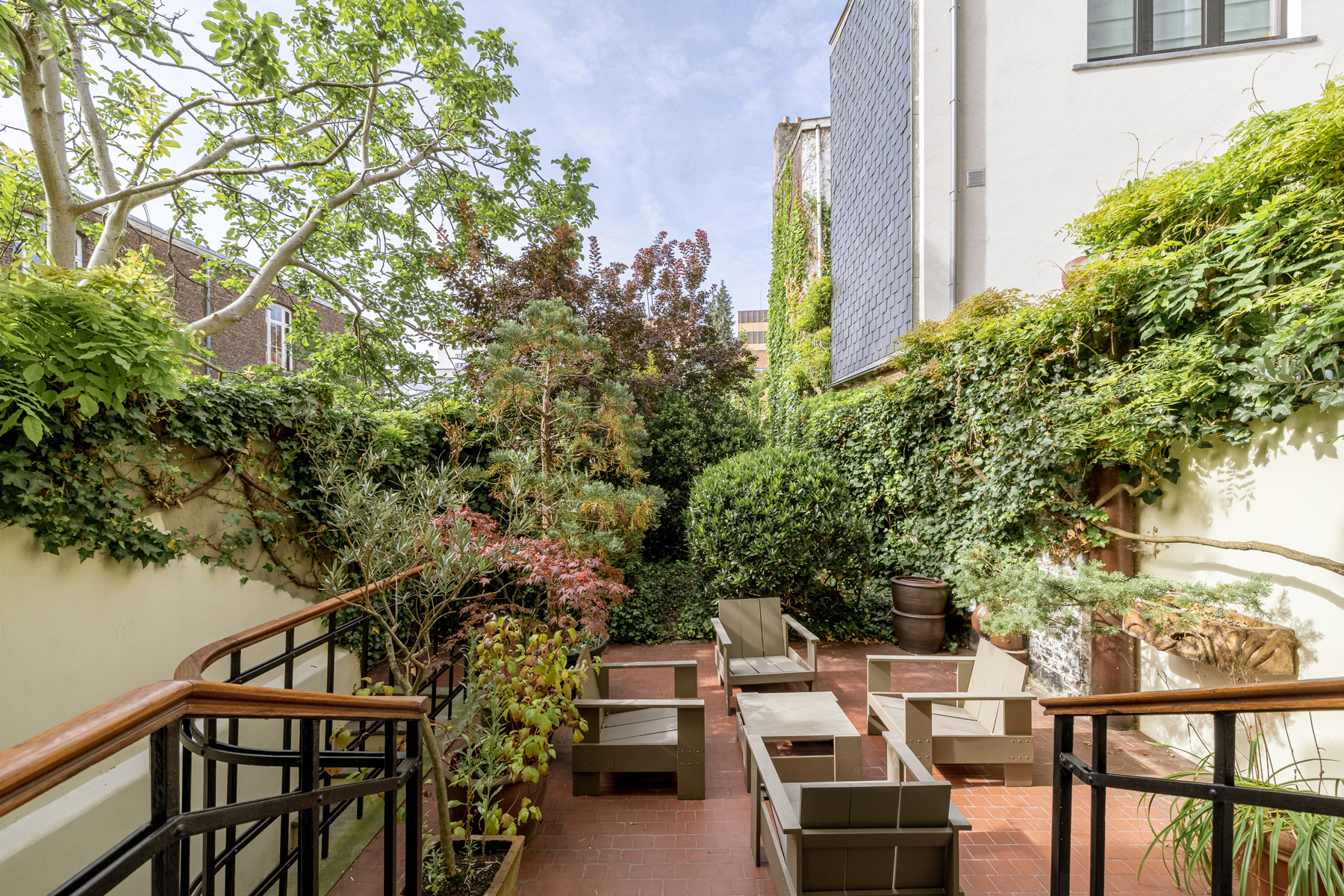 D’ une superficie de ±350 m², 4 chambres, 3 salles de bain, une terrasse et un jardin de 70 m² orienté au sud, la maison, répartie sur 5 étages comprend à l’entresol une cuisine et une salle à manger séparée. Au bel étage, deux salons dont l’un extrêmement lumineux, éclairé par de larges baies aux vitres transparentes et biseautées donnant accès directement à la terrasse et au jardin orienté au Sud.
