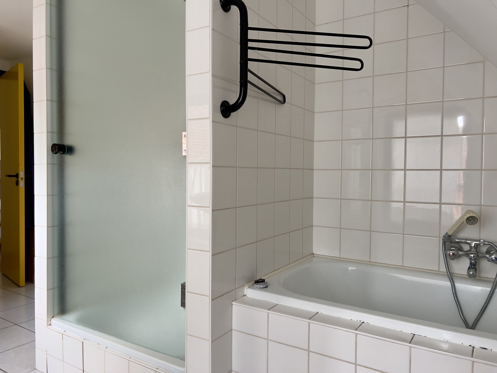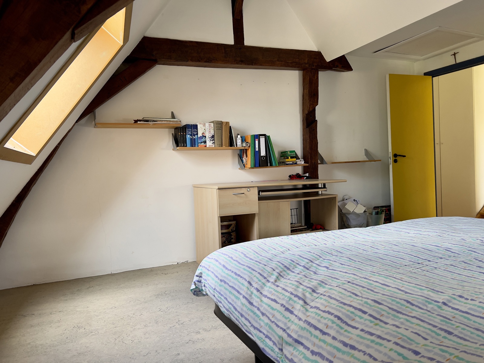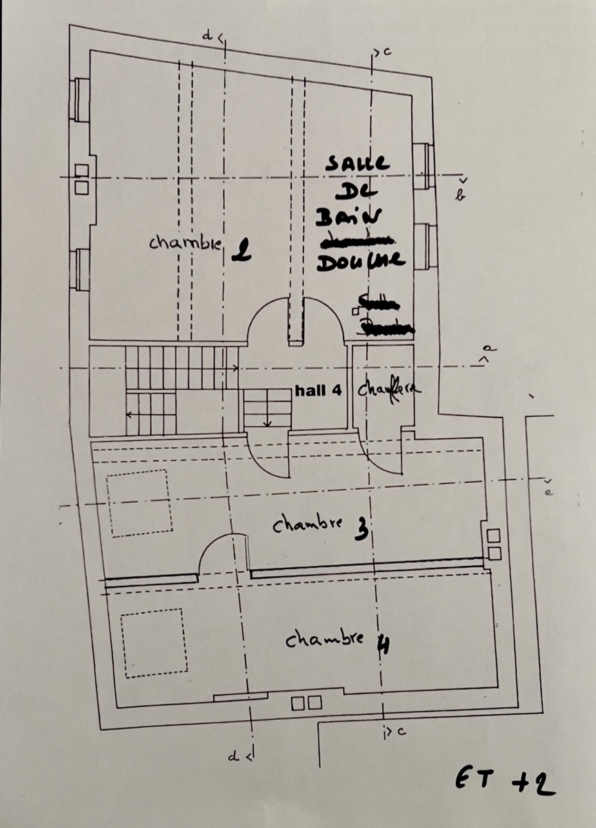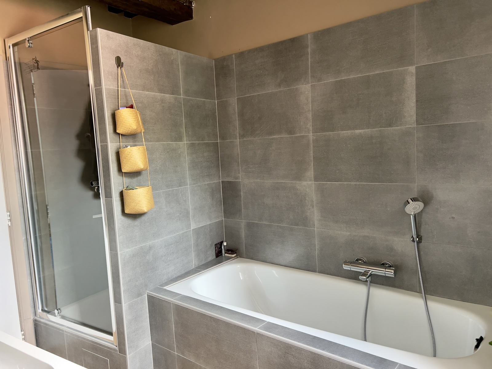 Op de tweede verdieping, links, bevinden zich een grote slaapkamer, een badkamer en een doucheruimte met toilet.