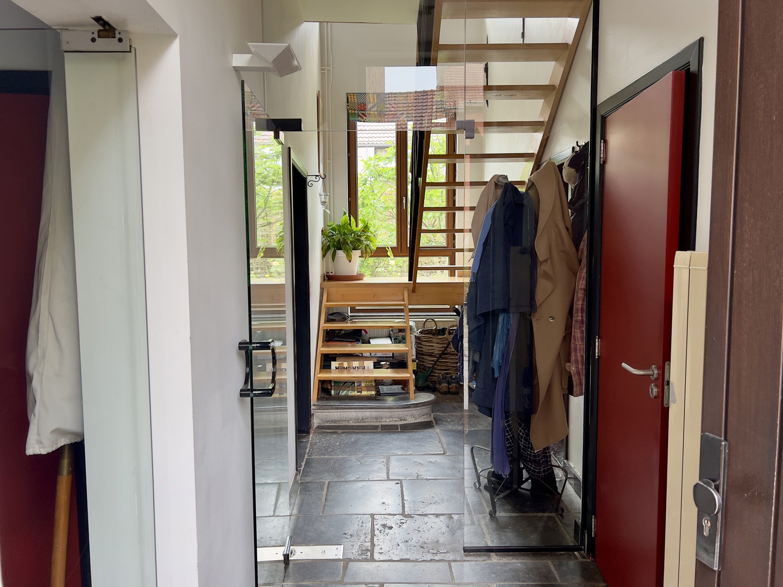 Vanuit de inkomhal bevindt zich rechts de eetkamer met open haard die uitkijkt op het terras en de charmante, vrij uitzicht biedende tuin op het zuidwesten. Rechts bevindt zich de volledig uitgeruste keuken.
