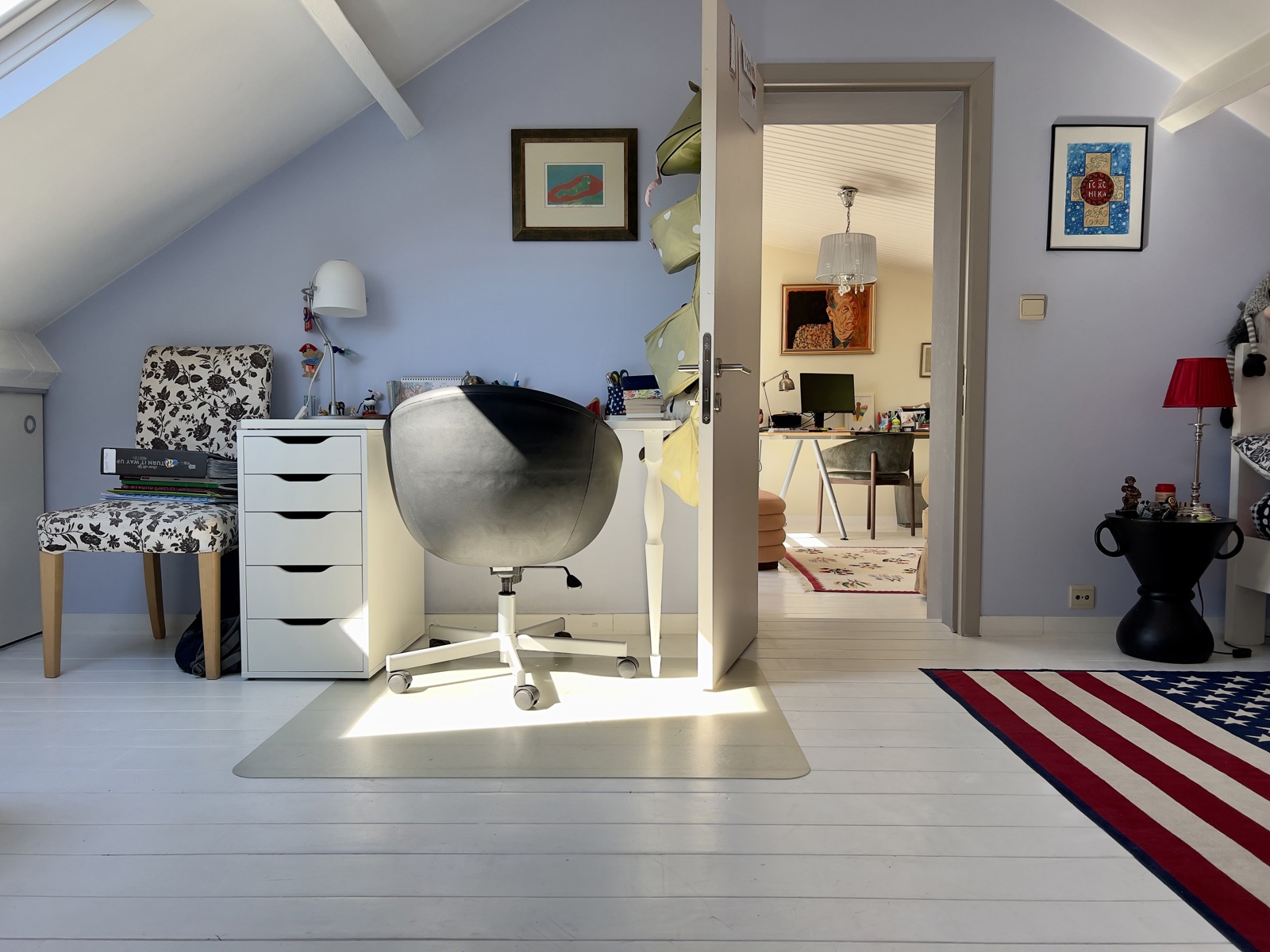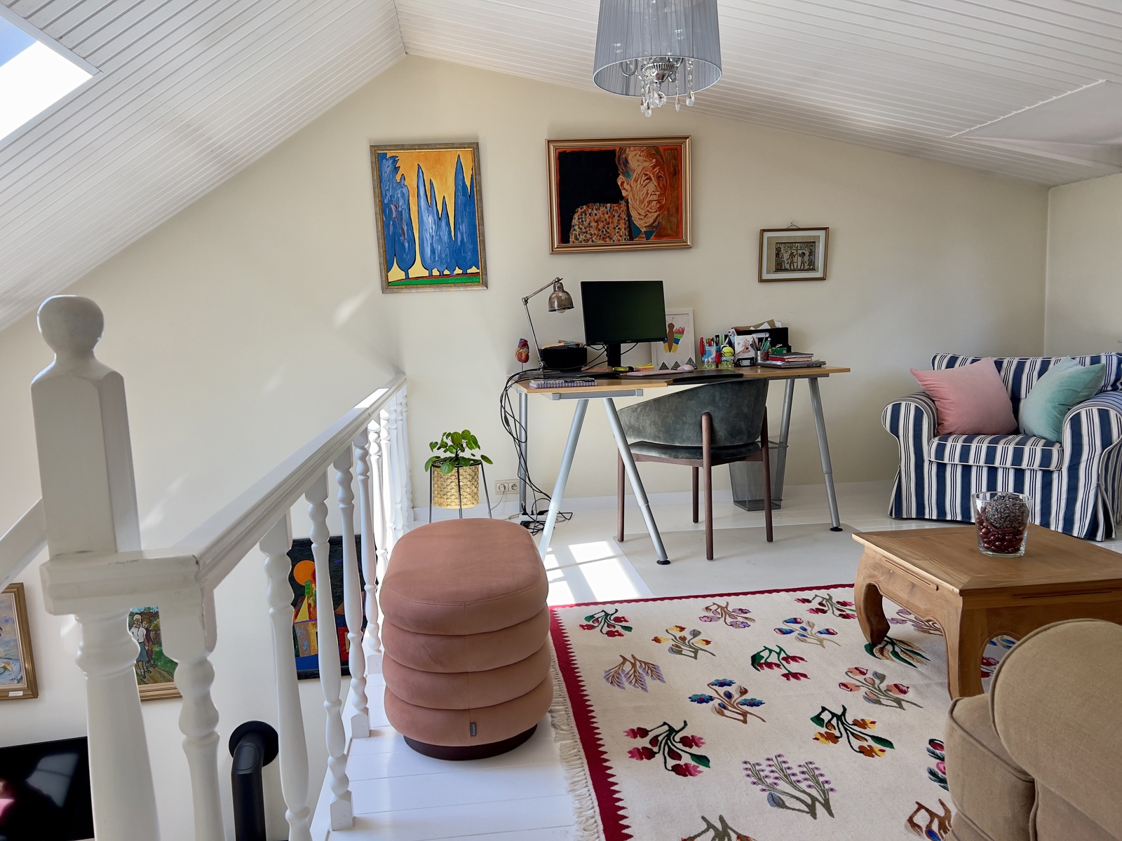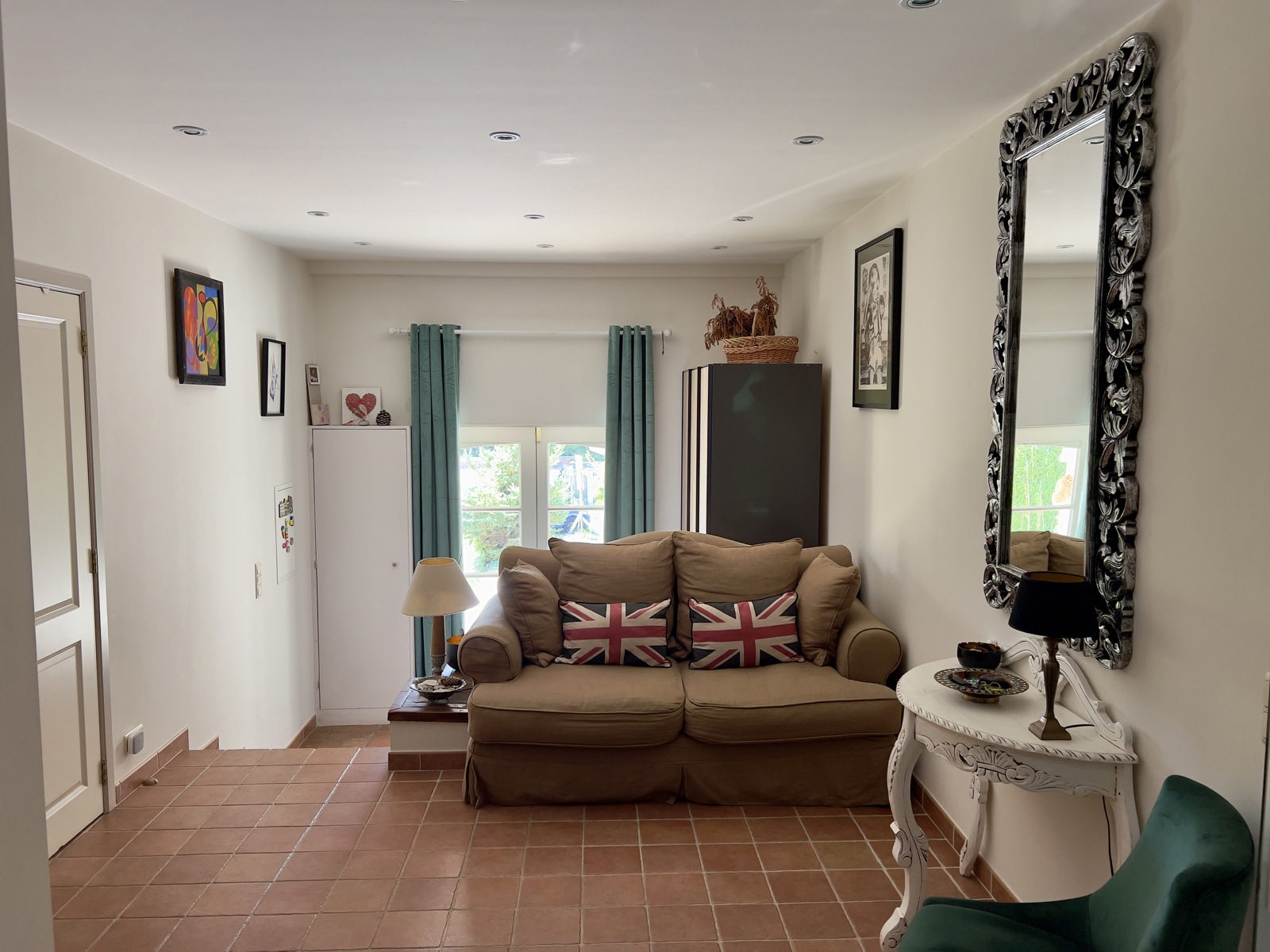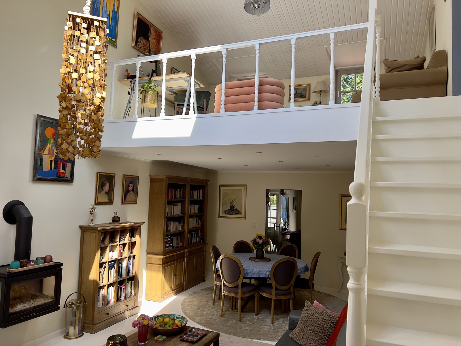 Boven, bereikbaar via de woonkamer, bevinden zich een grote mezzanine en een kantoor, evenals twee slaapkamers met eigen badkamer.